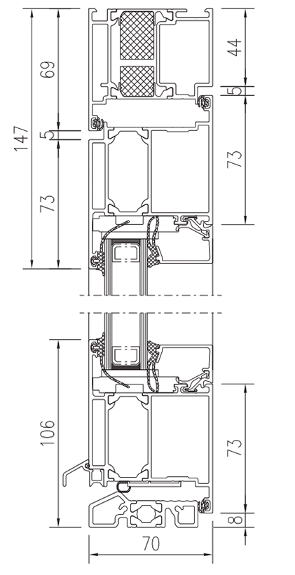 Schüco® ADS 70 HI. Trojkomorový systém s prerušeným viackomorovým tepelným mostom. Kompozitné EPDM tesnenie čiernej farby umožňujúce vysokú prispôsobivosť a vynikajúce tepelno-izolačné vlastnosti.